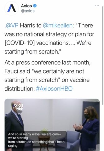 “There was no stockpile … of vaccines,” Harris responded. “There was no national strategy or plan for vaccinations. We were leaving it to the states and local leaders to try and figure it out. And so in many ways, we’re starting from scratch on something that’s been raging for almost an entire year!”