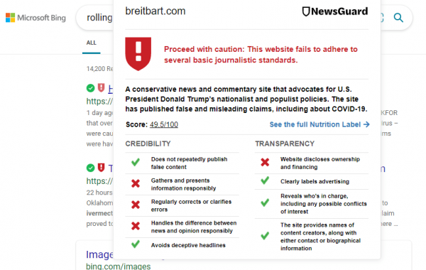 Users viewing search results with the NewsGuard browser extension switched on will see a red warning label on Breitbart News’ fact-check of Rolling Stone.
